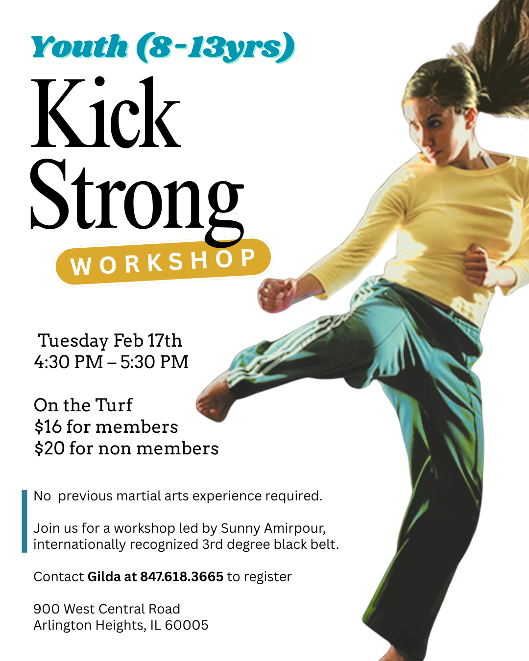No previous martial art experience required. Spots are limited, so don’t wait! Sign up at the service desk or reach out to Gilda with any questions 847.618.3665. We can’t wait to see you on the Turf! 💪🥋